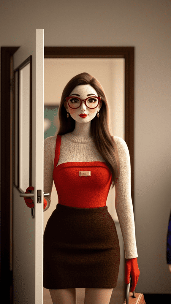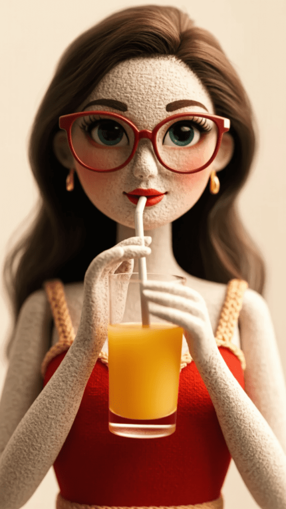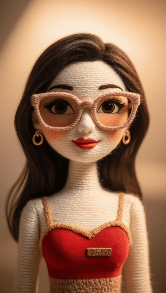 Image 1: Close-Up Shot, Centered View, Vector Art, Retro, Fashion, Eye Level, pretty amigurumi doll, straight hair, mauve rectangle spectacles, looks like a real life lady, spaghetti dress, background , Soft Light, Kodak Portra 400 –ar 9:16
