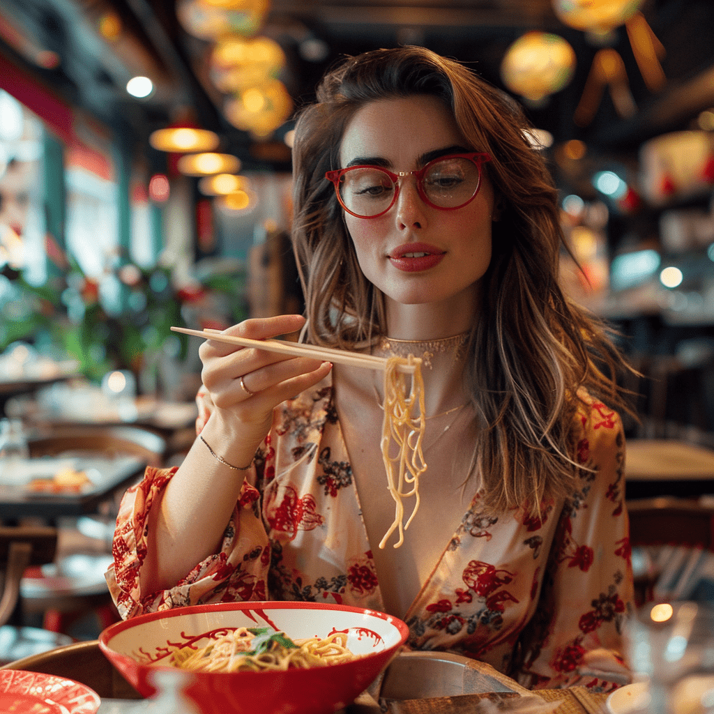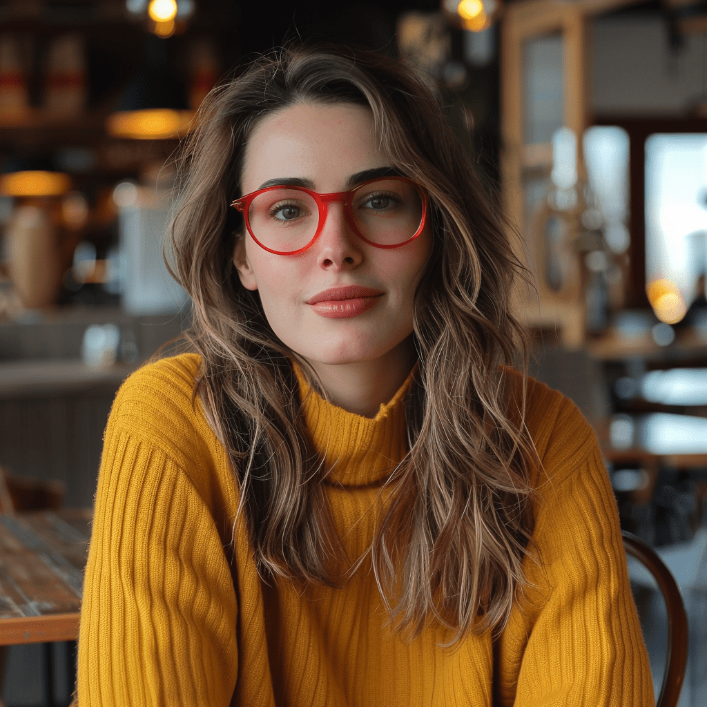Prompt: create an image of a 30 year old women wearing yellow pullover , red spectacles, background cafe –v 6.0 –style raw