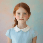 Prompt: A portrait, midbody shot of a 6-year-old girl standing in front of a soft, pastel-colored background. She is wearing a light blue dress with a white collar. Her face is youthful, with big, bright eyes and a sweet smile. The shot captures her from the waist up.