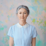 A portrait, midbody shot of a 45-year-old woman standing in front of the same soft, pastel-colored background. She is wearing a light blue dress with a white collar. Her face shows slight signs of aging, with gentle lines around her eyes and mouth, but she still carries a warm and serene expression. The shot captures her from the waist up.
