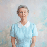 Prompt: A portrait, midbody shot of a 75-year-old woman standing in front of the same soft, pastel-colored background. She is wearing a light blue dress with a white collar. Her facial features are more mature, with noticeable wrinkles, but her eyes still shine with wisdom and warmth. The shot captures her from the waist up.