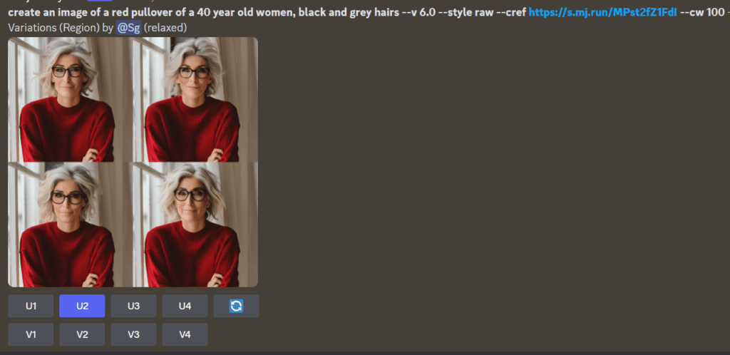 In the above three images, if you notice, all three ladies wearing pullovers of the same design, against the same background, and wearing spectacles of the same color. I have created these using the ‘cref parameter’ and ‘vary region’ parameter of MJ.