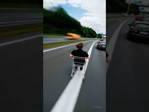 Man with dark blond hair, wearing a black polo shirt is sitting in a shopping cart and being pulled by a a German autobahn., The camera is behind the shopping cart and moves along with it, they are on a a highway and full speed