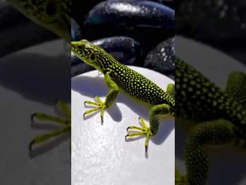 Overhead shot, close-up of a leopard gecko. Vibrant yellow-green leopard gecko with distinctive black spots covering its body. The lizard is positioned on a pristine white rock, showing its splayed feet with visible toes. Dark rocks surround the white rock, creating contrast with the bright gecko and its perch