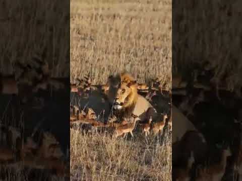 In the center of a dry savanna landscape, a majestic lion sits,surrounded by an astonishingly large number of cute little impalas. impalas form a dense circle around the lion.