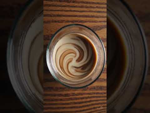 Top angle view, centered view of a creamy coffee getting swirled into a glass