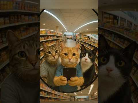 Three anthropomorphic cats, stand in a grocery store aisle, posing for a selfie using a fisheye lens mirror, background mall.