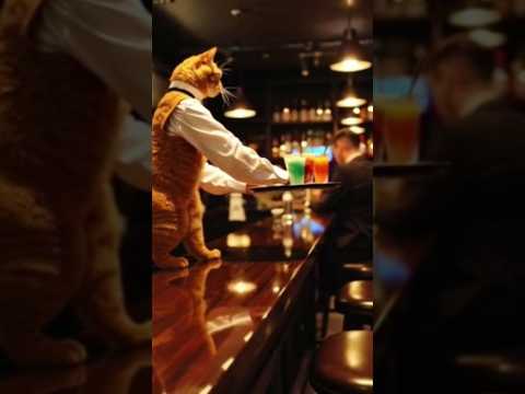 Prompt 1:An orange big cat as a waiter at a a bar, serving drinks to people